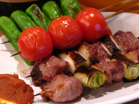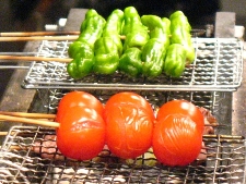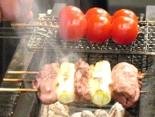 【左】 手前が名物のカシラ&深谷ネギ。 まるっとプチトマトも頼みます。