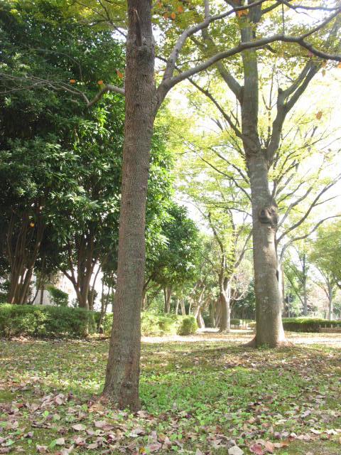 後ろは常緑樹。 手前の木には葉っぱがあるので、冬でないことがかろうじてワカル1枚。