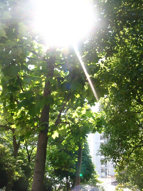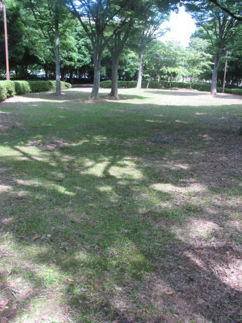 広場は今、夏の陽を浴びて影も緑もくっきりこ。 なんとも走りやすそうです。