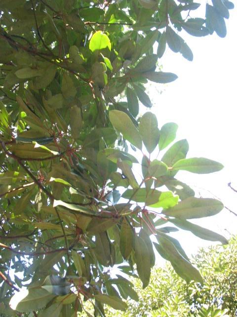 垂れ下がった濃い緑の大きな葉と赤い茎が可愛らしい木です。