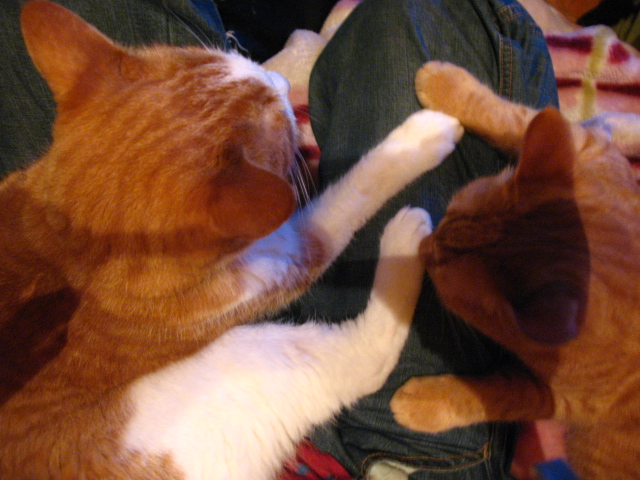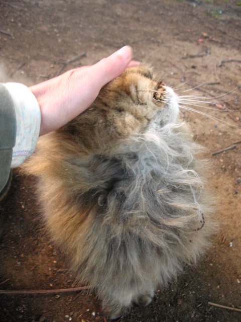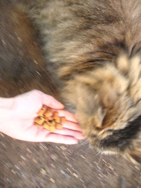 カブちゃんとミケちゃんはご飯中。 うわーモッサ、悪い人に苛められて逃げちゃったのかなー。