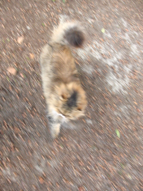 お腹が空いてるのかも…とオヤツを取りに戻ります。 追いかけて来るけど、植込みでストップ。