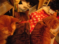 タオルを枕にして便意を待っているたーまんを、みんなで見守っています。 おちゃびんはこたつの中。