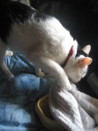 退院してからおちゃびんは、随分長いことこの 「猫ソファ」 でご飯を食べていました。