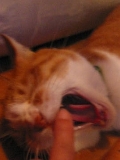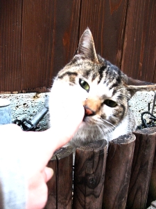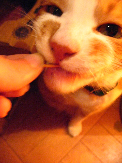 でも、猫の体にはヨクナイから、3本まで。 握って、ゆっくり食べさせます。