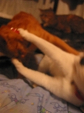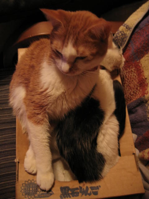 左から、長い尻尾だけ…が、おちゃびん。 介護チームの寿実ちゃん、たーまん。