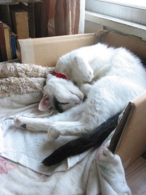 窓辺の籠で先に寝てしまったおちゃびんに、息子の寿実が寄り添ってうとうとしています。