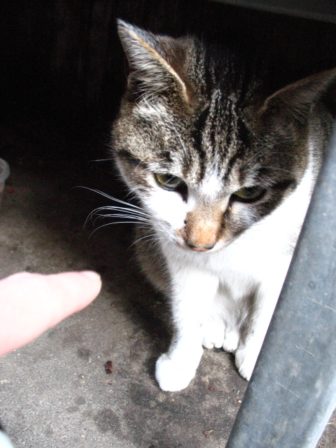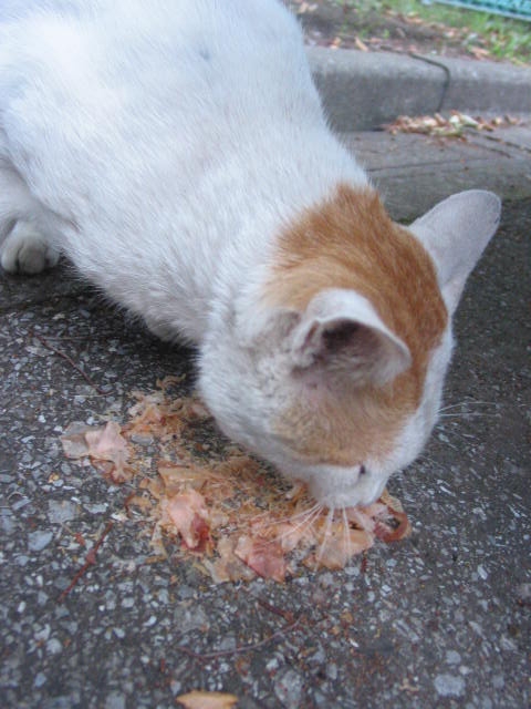 カアチャンハ 「お外に白ちゃんがいた!」 ッテ、僕ノ鰹節モッテ、走ッテ行ッチャッタ。