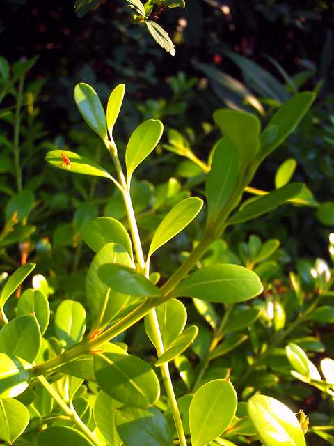 ツヤツヤ葉っぱの上に、赤い謎のちびっこムッシー。