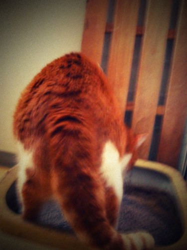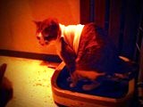 猫のトイレは3個置いてありますが、人間のトイレの隅に据えたこの小さなトイレが一番人気。