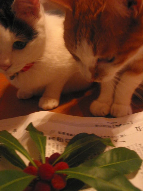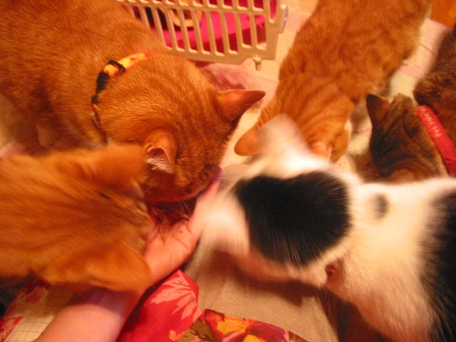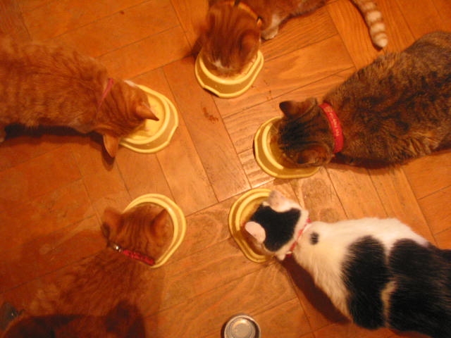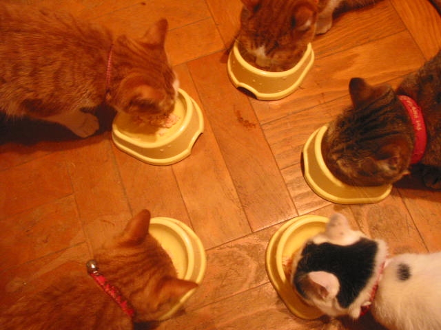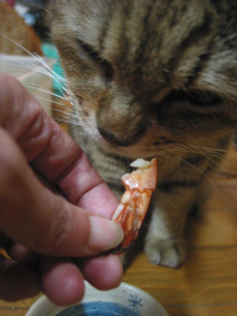 「嗅ガセテー」 by寿実ちゃん。 猫たち全員集合。 うちの猫たち、海老は食べません。
