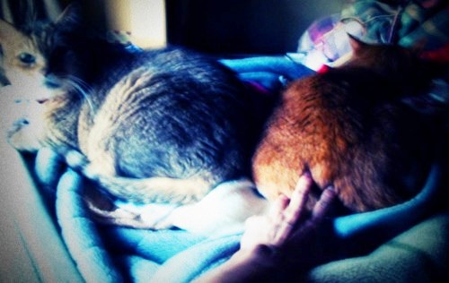 >生まれた時からキキといっしょで、小さいときは一緒に寝てたけど、大きくなってからは二匹とも絶対に一緒に寝ないです。